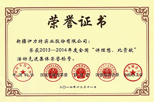2014年-2018年獲得的成就 1、2014年12月新疆伊力特實(shí)業(yè)股份有限公司獲得中國科協(xié)、發(fā)展改革委、科技部、國資委、全國總工會(huì)聯(lián)合頒發(fā)的2013-2014年度全國講理想、比貢獻(xiàn)活動(dòng)先進(jìn)集體榮